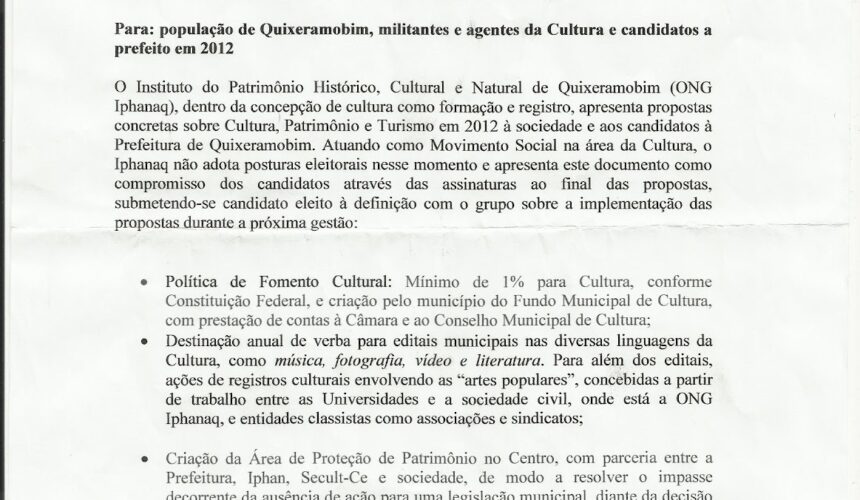 O Instituto do Patrimônio Histórico, Cultural e Natural de Quixeramobim (ONG Iphanaq) apresenta propostas da “Carta da Cultura”. O Documento é fruto de debates da instituição com a sociedade civil em Quixeramobim, a partir de discussão entre os integrantes e ações da entidade no município, desenvolvidas através de Projetos como o Ponto de Cultura Patrimônio Vivo (que acontece no Liceu), o Papo Cultural e Grupo de Leitura Sertões e Memórias, na Casa Antônio Conselheiro, e o Cineclube SESC-IPHANAQ, com apresentação mensal de filmes nos distritos de Quixeramobim.