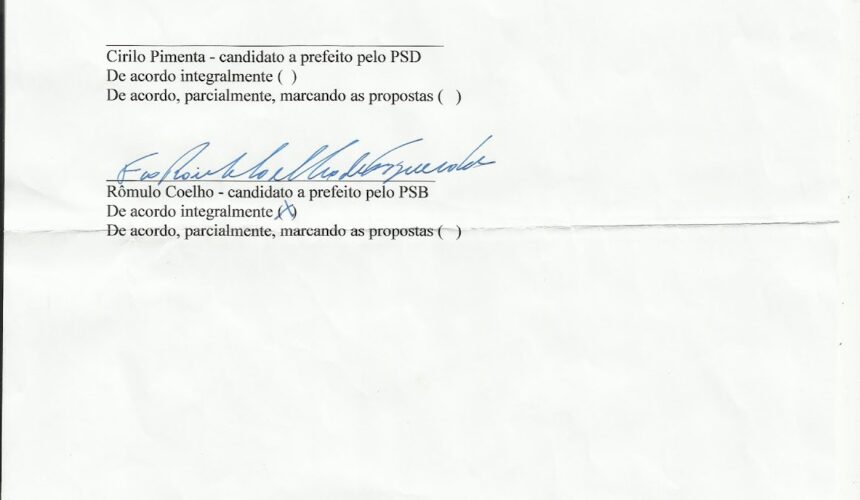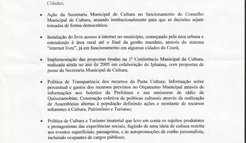 Ainda 48 horas antes de ser divulgado à população, o documento foi encaminhado às duas candidaturas que disputam a Prefeitura de Quixeramobim, com espaço ao final para assinatura dos candidatos, como forma de assumir o compromisso com as propostas, e dialogar a partir das mesmas na futura Gestão municipal do município (veja link). O documento foi entregue às candidaturas na quarta-feira, 03 de outubro, com prazo estabelecido para retorno dos candidatos na sexta-feira, 05 de outubro, 12h. Na semana anterior, o documento fora enviado às candidaturas pelos e-mails de contato disponibilizados nos sites oficiais. A Carta da Cultura registra a assinatura do candidato Rômulo Coelho (PSB), após entrega e contato com o Coordenador Cândido Filho. O documento com propostas de Gestão Cultural não contou com apoio do candidato Cirilo Pimenta (PSD), que não firmou compromisso com as mesmas. O documento foi entregue no comitê ao advogado Ricardo Cavalcante, que representa a candidatura. Em seguida, o mesmo recebeu contatos do Iphanaq, afirmando que conversaria sobre as propostas com o candidato Cirilo, e retornaria com posicionamento, o que não ocorreu até a noite de ontem, sexta, conforme combinado.