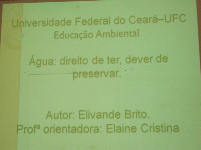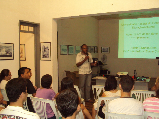 Elivande Brito fez uma rápida contextualização da situação da água no mundo, no Brasil e em especial no semiárido nordestino e suas implicações climáticas como fenômeno ainda não compreendido por grande parte de nossa população. Em seguida, o professor Elivane direcionou a sua apresentação para as condições da água em Quixeramobim e os cuidados que deveriam ser tomados pelo poder público e sociedade civil para uma maior educação ambiental em relação ao uso da água.